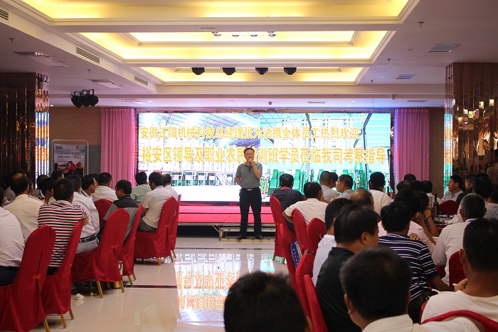 9月13日下午,裕安區(qū)職業(yè)農(nóng)民培訓(xùn)班一行人蒞臨我公司考察指導(dǎo),此次培訓(xùn)班由200多名種植大戶組成,場(chǎng)面十分熱鬧,公司張為法總經(jīng)理、許為青副總經(jīng)理、總經(jīng)理助理胡家冀、銷(xiāo)售部部長(zhǎng)張杰等參與了此次接待活動(dòng),張為法總經(jīng)理代表安徽正陽(yáng)機(jī)械科技有限公司表達(dá)了對(duì)于他們此次來(lái)訪的熱烈歡迎。
